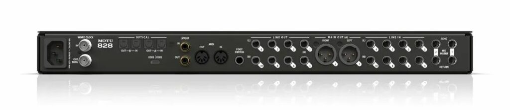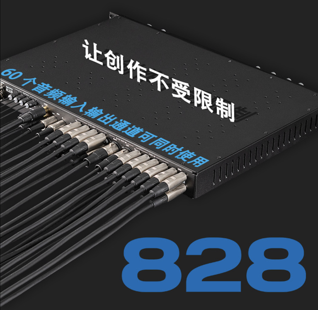 全新的 828 拥有更为接口,包括两个 XLR/TRS 组合输入、两个 Hi-Z 输入、两组光纤输入/输出、两个 MIDI 接口和字时钟输入/输出。专用的话筒插入可以轻松连接外部设备,而 24 通道 DSP 可提供丰富的效果处理。
