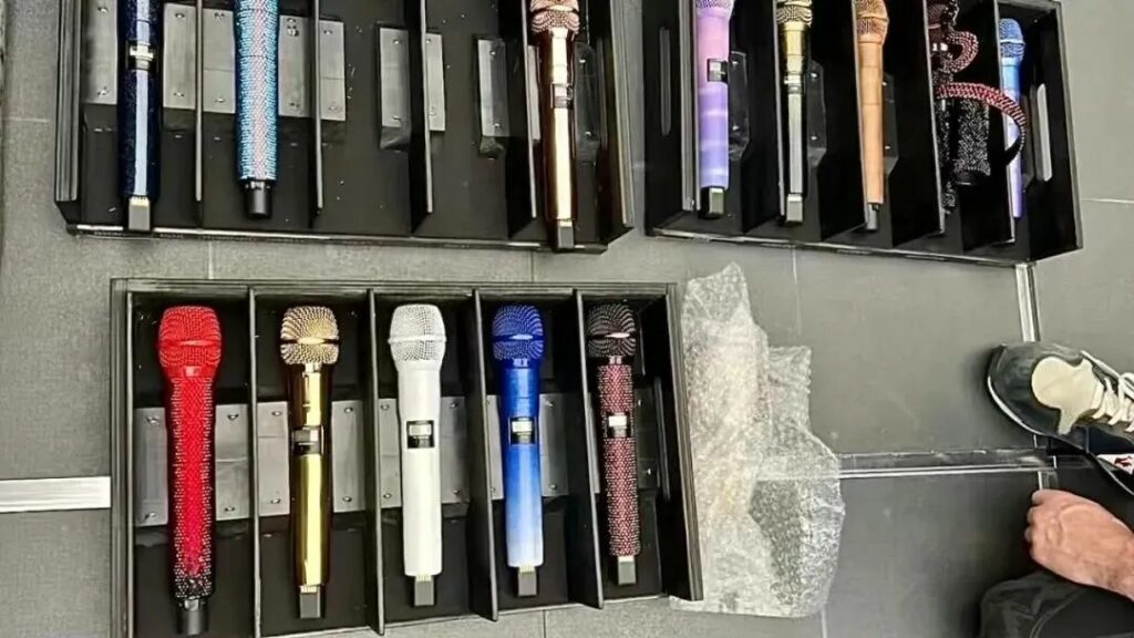 在Taylor Swift 这一轮世界巡演中,同样选择了这款sE 的无线麦克风头。在不同环节与曲目时的人声话筒全部使用了特殊定制颜色和造型的无线麦克风。霉霉使用的是sE Electronics v7 MC1话筒头搭配在麦克风无线系统中。图中是为本轮演唱会定制的13支话筒。