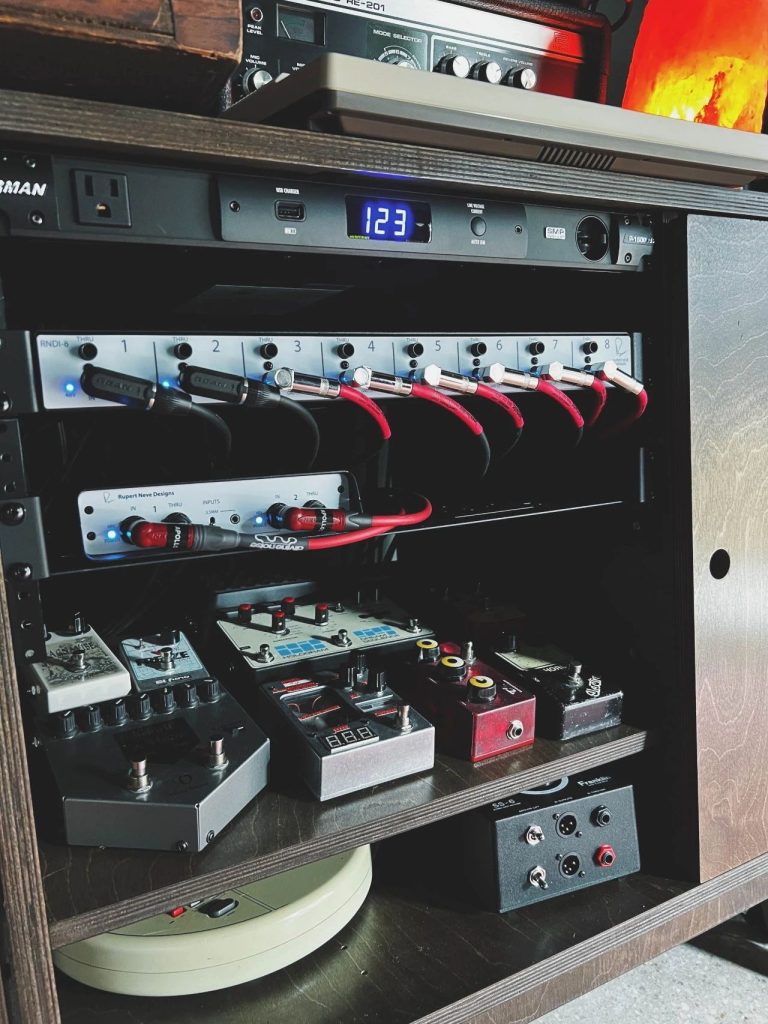 在研究DI盒的时候,我看到了许多经常出现的名字,但我总觉得这些公司忽略了一些对DI盒来说非常重要的东西。然后我看到了一个视频,Scott Hansen(又名 Tycho) 在谈论他非常喜爱的 RNDI-8。这基本上就是我开始研究它的全部动机了。自从我开始录音以来就一直知道 Rupert Neve 这个名字,它代表着优雅和品质,这两者正是我想要在新工作室里强化的东西。拥有一个 8 通道的DI盒意味着我可以将所有合成器和磁带延时效果器都连接起来,只需要使用一条 8 通道的 XLR 线将它们从工作室后面连接到声卡接口上。这正是我想要的——简洁、优雅和品质。不过后来我又改变了吉他效果器的位置,还需要一个立体声DI盒,我毫不犹豫地再次选择 Rupert Neve Designs的 RNDI-S,这样我的 10 路音频需求就可以全部使用统一的设备了。