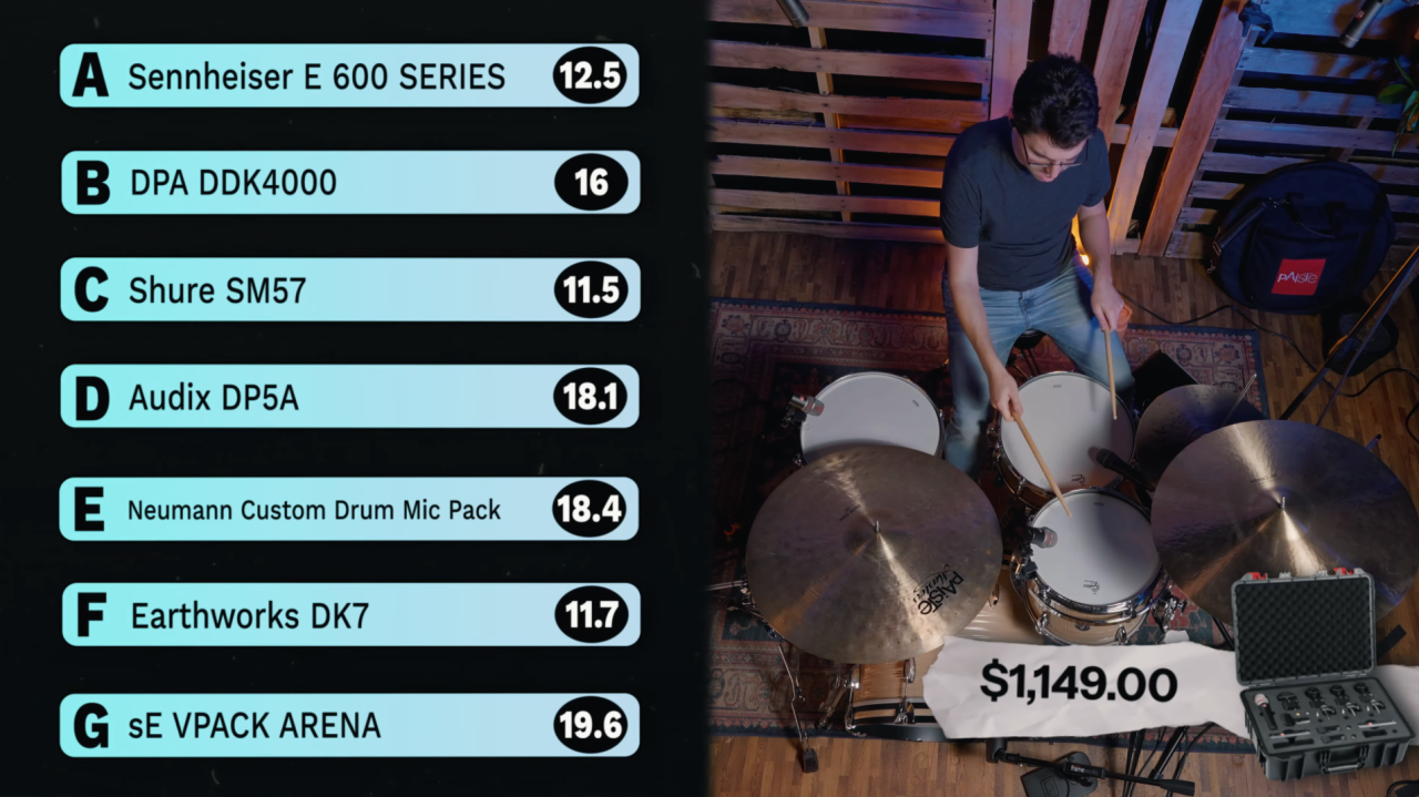 本期视频中,油管播主Dimitri和Bob一起盲测了7款不同的鼓麦克风套装(分别标记A-G组),共计测试了42支麦克风。