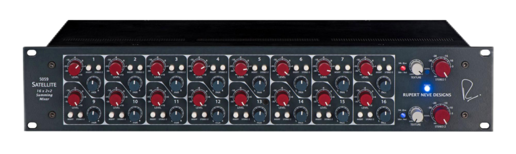 5059是由Rupert Neve Designs设计的一款16通道的2+2 Summing混音台。5059具备16个通道,每个通道都有独立的电平、声像、插入、立体声2发送以及主质感控制,这使得它能够轻松地与外部设备集成,并且可以完全控制两个独立的混音路径 。这种特点与功能允许David Roy实现这种操作,让声音质感更加丰富。