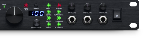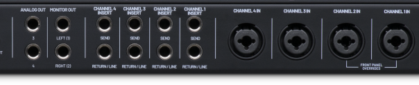 • 4个前置放大器,4个乐器DI输入,4个线路通道插入/返回,3个立体声耳机输出,2个立体声模拟输出,S/PDIF输入/输出,ADAT输入/输出和字时钟输入/输出