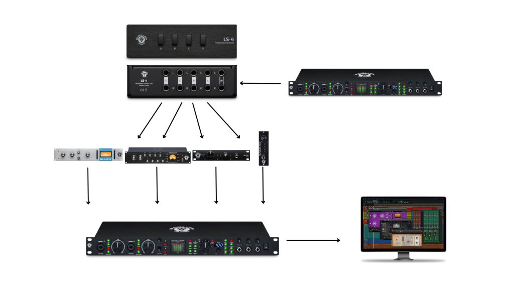 将原始信号输入到LS-4输入,并将不同的效果器连接到输出A-D。将您的处理器输出连接到您的音频接口输入——按下A-D按钮,试听不同的效果处理器对您的信号处理效果。