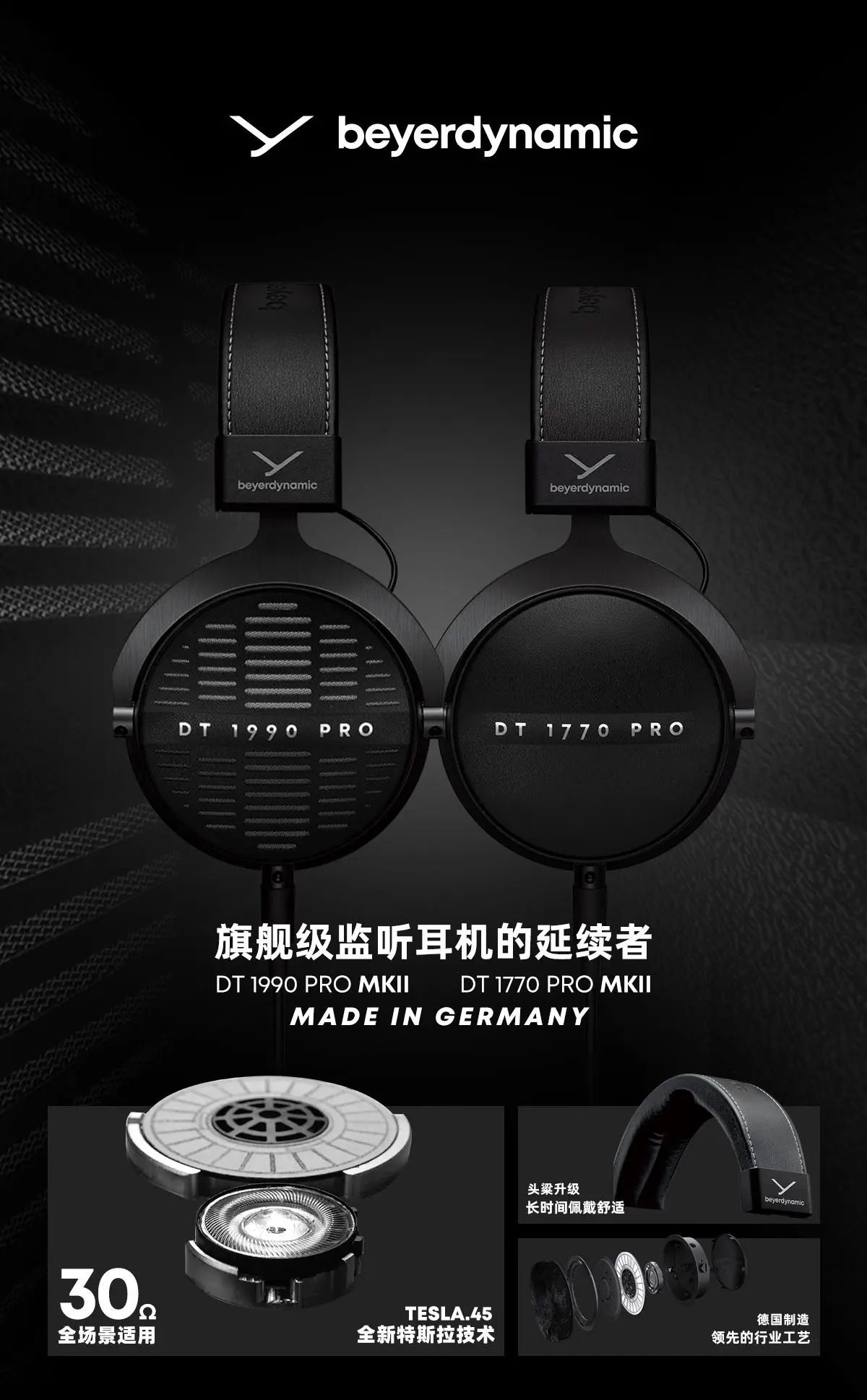 德国专业音频厂商——拜雅(beyerdynamic)即将推出其广受欢迎的旗舰级专业监听耳机新品:DT 1770 PRO MKII(封闭式)和DT 1990 PRO MKII(开放式)。这两款耳机的核心均采用了拜雅在海尔布隆全新开发和制造的特斯拉单元,TESLA.45发声单元。