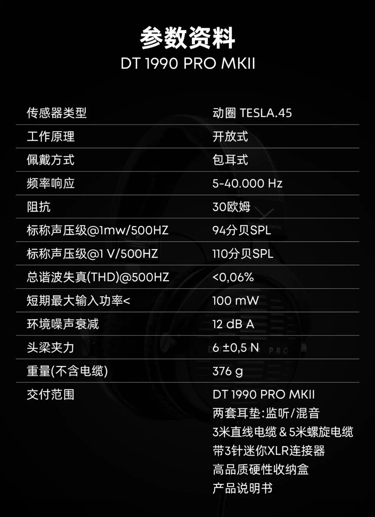 DT 1990 PRO MKII标配的天鹅绒耳罩通过轻微的低音增强确保了三维声音再现,而混音和母带制作专用的天鹅绒耳罩则提供了分析性的参考音质。两款耳机均配备了一条3米的可拆卸电缆和一条5米的螺旋电缆,每条电缆都装有可锁定的3针迷你XLR连接器。DT 1770 PRO MKII和DT 1990 PRO MKII均安全地存放在一个高品质的硬盒中。