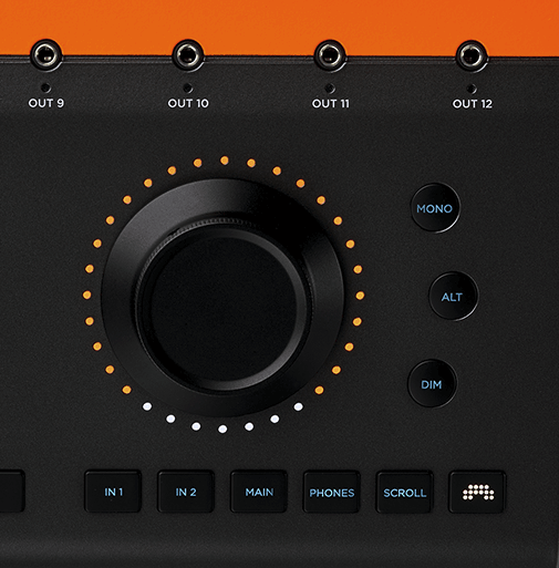 这款设备配备有六个模式(Mode)按钮,与触摸感应中心旋钮配合使用,用户可以方便地调整接口参数和对软件进行深度控制。它能够管理输入增益,调节两组音箱及耳机输出的音量水平。