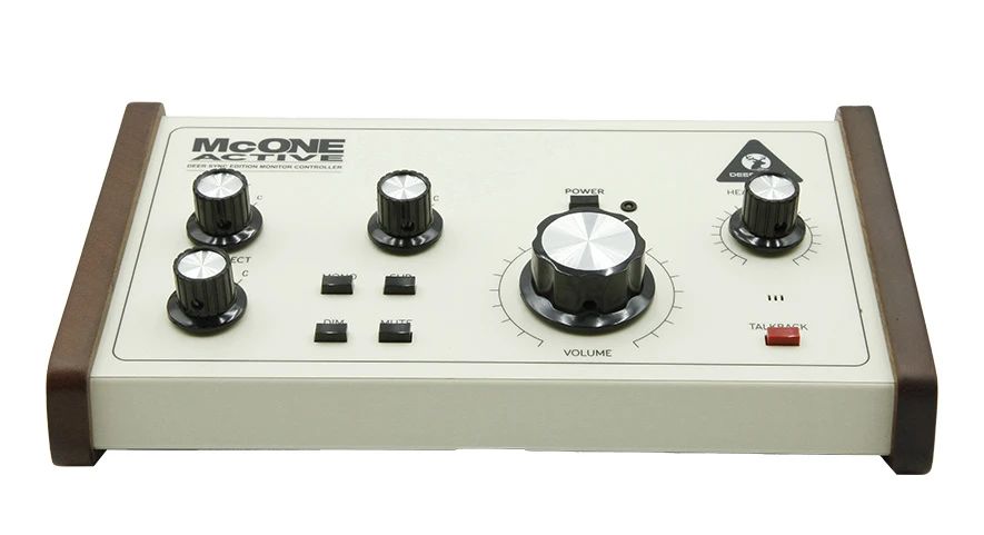 DEERSYNC McOne是一台功能强大的主动监听控制器。它有三组立体声输入和输出,用于快速切换控制室里的近场、中场、远场三对监听音箱。总音量大旋钮质感极佳,让控制监听音量极其方便。除此之外,McOne还有对讲功能,按下红色对讲按钮就可以和棚里进行对讲,无需占用声卡通道,不影响录音。它优秀的耳放用来放大录音师主耳机,同时也有专门的CUE接口连接录音棚内的耳分。