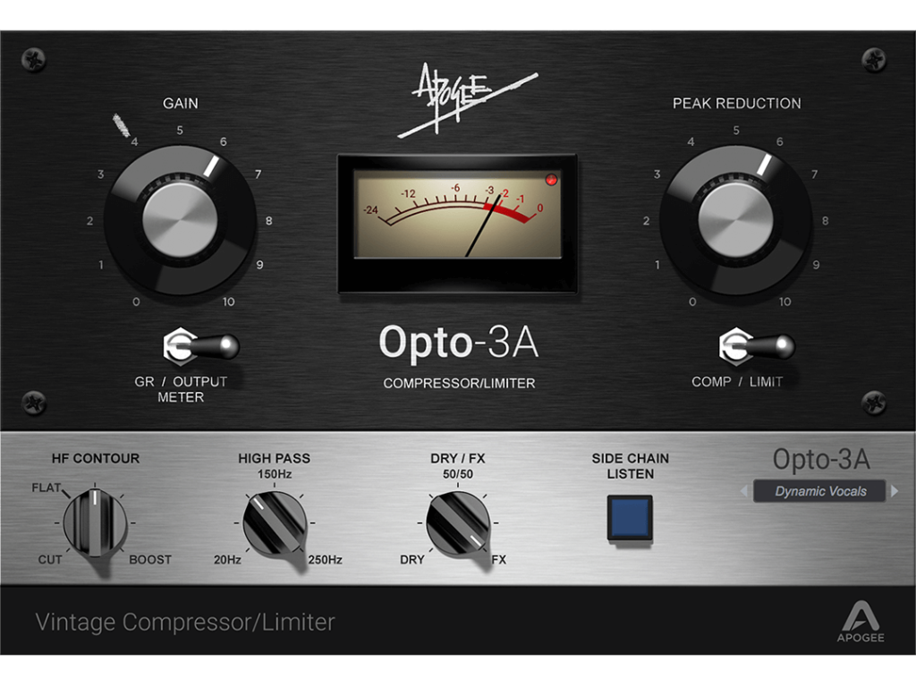 经典的光学压缩器/限幅器,Apogee重现了硬件模型的压缩反应特性。对HF功能进行了扩展,具备侧链HP滤波器和干/湿比例调节。