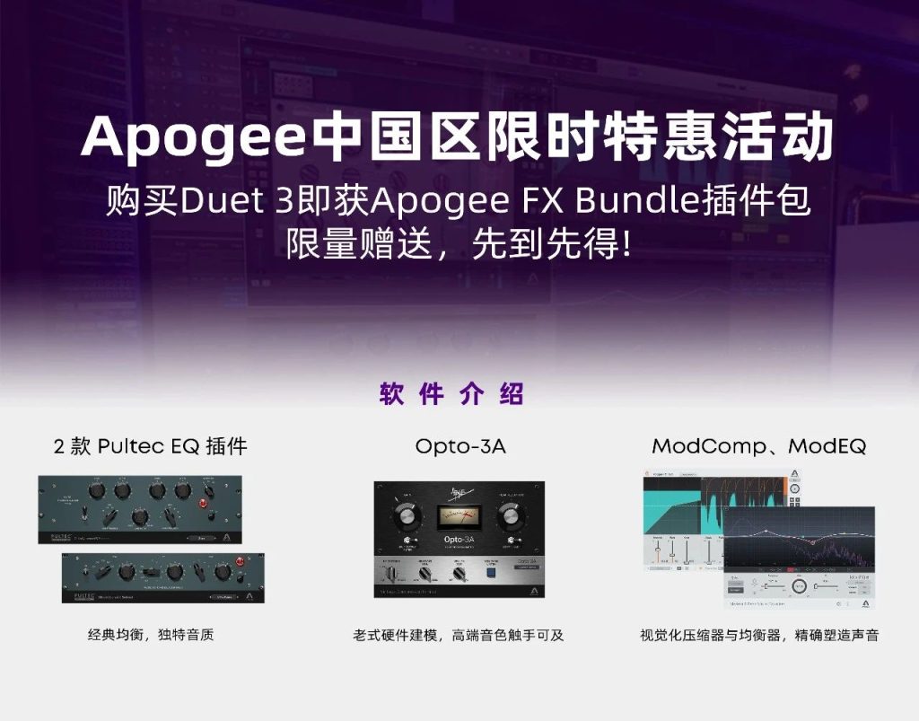 即日起,凡购买Duet 3的用户,即可免费获得Apogee FX Bundle插件,价值499美元!直观的控制界面,出色的声音品质,Apogee插件可让您的作品更加专业并脱颖而出。