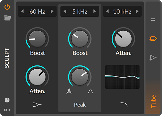 Sculpt 基于 EQP-1 的元素建模,以在软件领域展现它的功能和特质。您只需让音频信号通过 Sculpt 并启用“Tube”染色,即可为您的声音添加好听的饱和染色。如果您更大胆,请试试吧:使用 Sculpt 进行大幅度的boost听起来可能比使用其他软件均衡器更平滑。