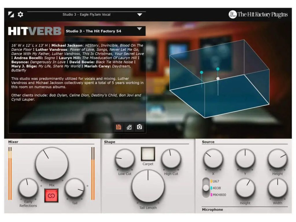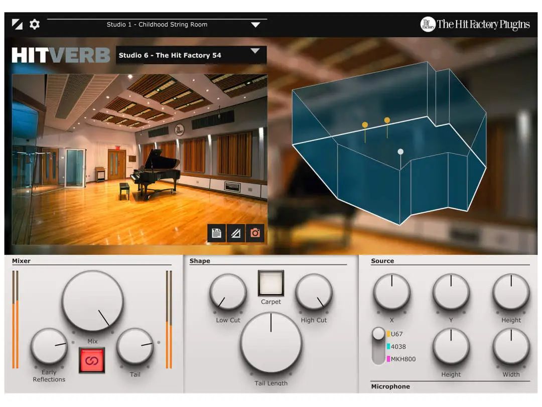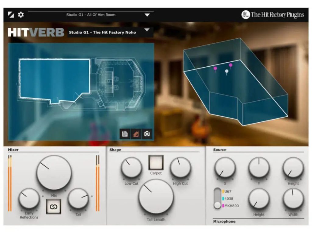 HitVerb不仅仅是一个简单的混响插件,它提供了全面的控制选项。你可以自由调整虚拟麦克风的距离和位置,包括高度和宽度,选择三种经典麦克风型号:Neumann® U67s、Coles® 4038 Studio Ribbons和Sennheiser® MKH 800 Twins。此外,低切和高切滤波器、尾音长度等参数都可以精细调整,甚至只需点击一下按钮,就能在地板上添加或移除地毯,以改变声音反射效果。