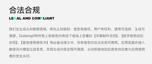 最后也是最重要的一点:Dubbing X 所有音色均合法合规,可商用,用户无需担心版权问题。