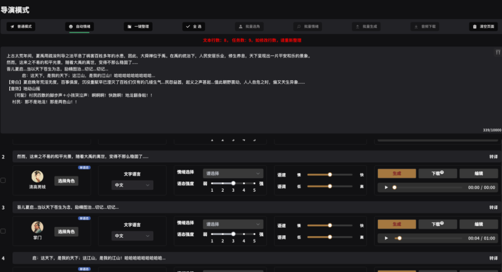 导入文本后,根据角色需要批量匹配音色模型。大模型根据文本情绪自动调整音色情绪,支持手动调整。快速生成文本音频。配备多种音色和情绪模型,适配不同类型小说(如悬疑、浪漫),提升听众的沉浸感。文本框直接翻译多语言,快速支持多语言版本制作,无需重新录制,满足全球化推广需求。