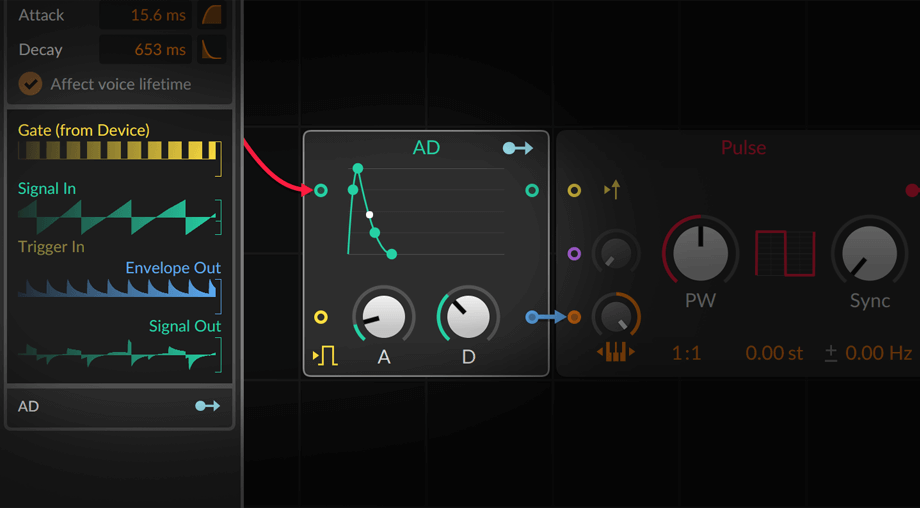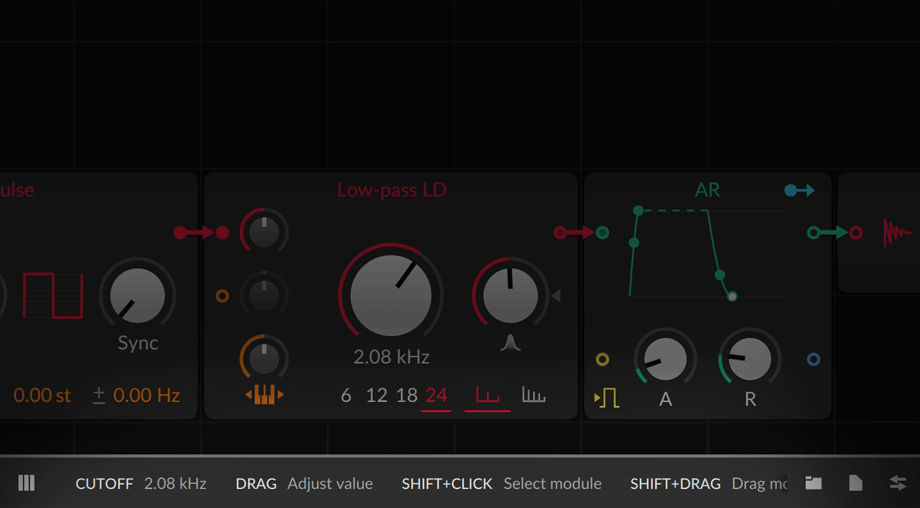 在 The Grid 里,所有信号都是立体声的。虽然接线时只有一根线,它传输的是双通道立体声信号。不仅是音频信号,包括音高、相位、触发信号在内的所有信号都是立体声的。所以当你调整这些控制参数或timing时,都会直接影响到最终的音频输出效果。