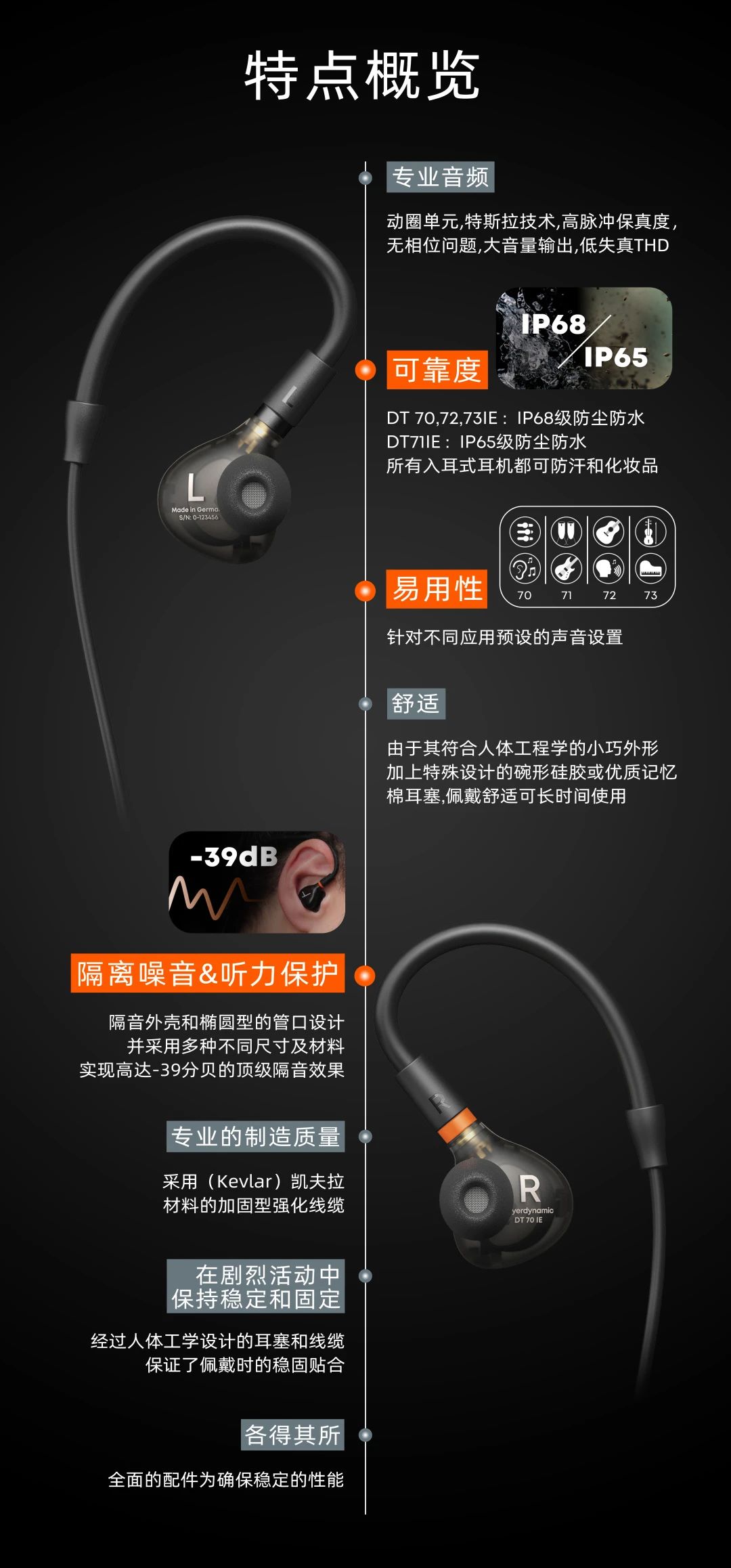 DT IE系列耳机均在德国手工制作,确保了高品质和耐用性。其中连接线采用Kevlar材质的加固线缆,抗强力拉扯,四款型号均具备出色的防尘防水性能。