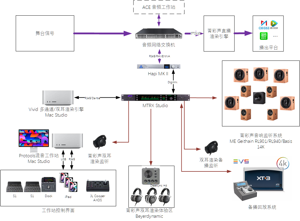该系统从舞台信号捕捉到最终播出,整合了Merging HAPI、Avid MTRX Studio、Pro Tools和S1 Dock等高端设备,进入Pro Tools进行专业混音,实现全流程高效处理。