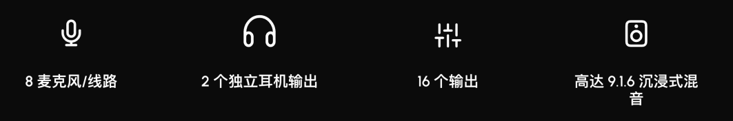 强大的 9.1.6 Atmos 混音接口,具备 8 个麦克风/线路输入和 16 个线路输出,同样适用于传统的录音和混音工作流。