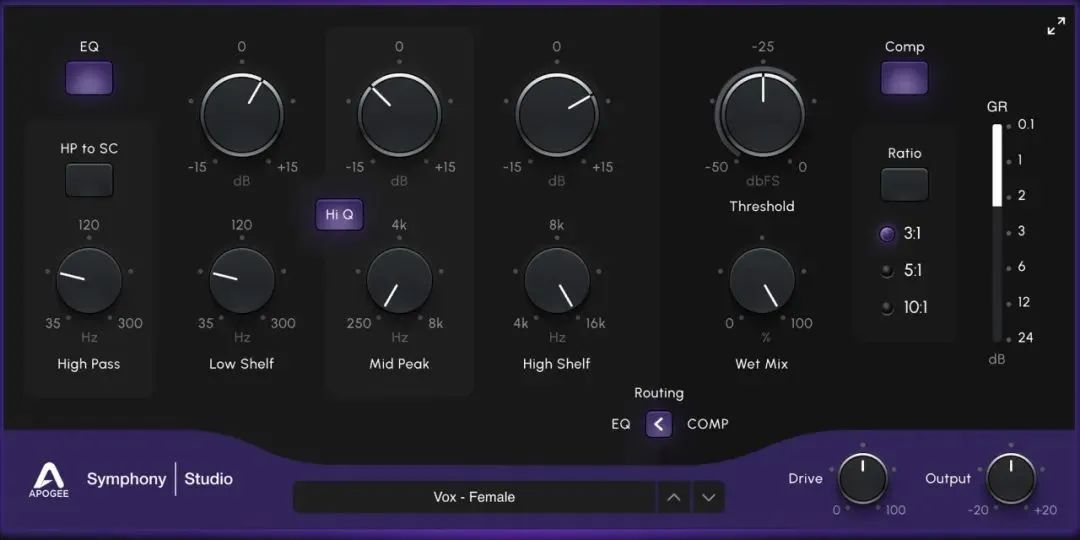 Symphony Studio配备的先进输入DSP,为您的录音注入了模拟音频的丰富韵味。通过一系列工具,如均衡、压缩和饱和度控制,以几乎零延迟的性能精准雕琢您的音轨,让您的录音轻松获得深邃的层次感、独特的个性魅力以及细腻的光泽感。
