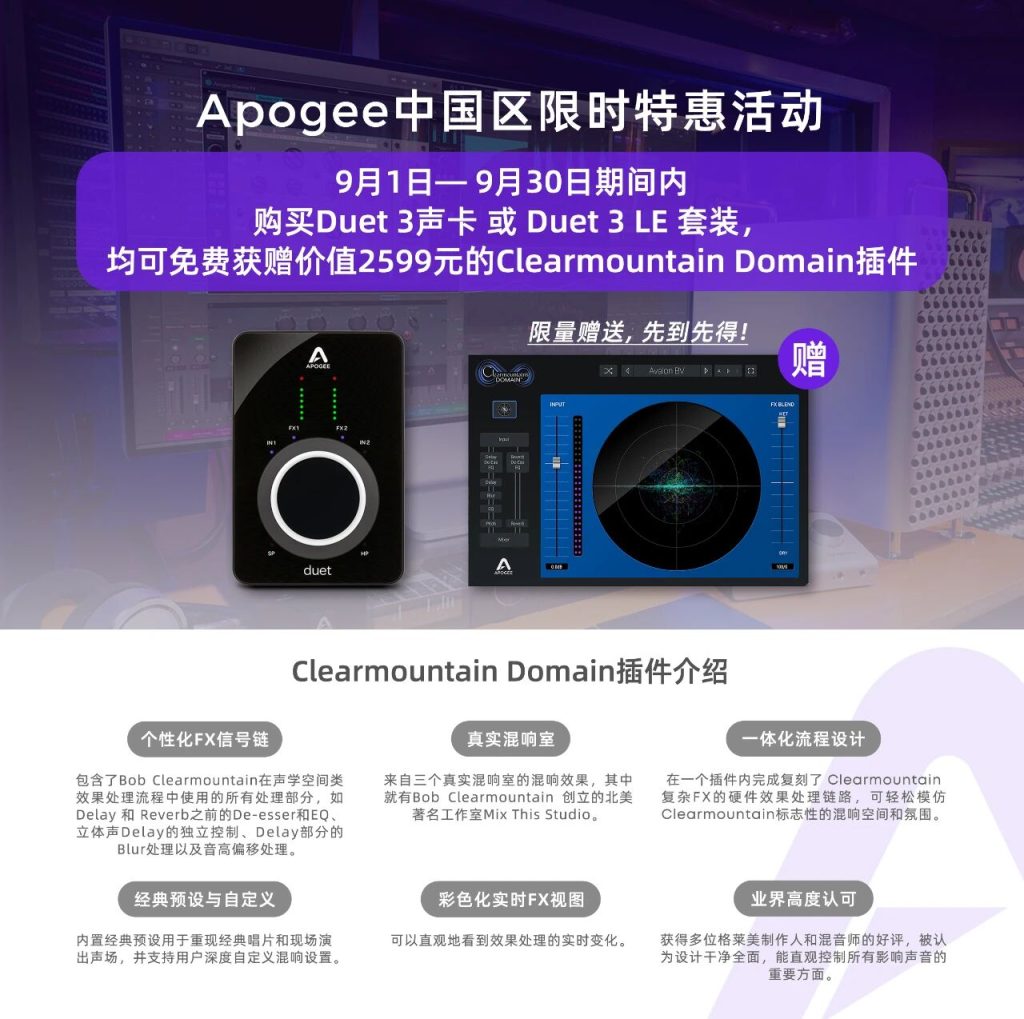 即可免费获得价值2599元人民币Apogee Clearmountain Domain插件!