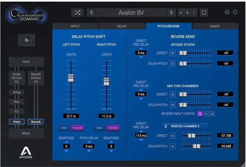 个性化FX信号链:包含了Bob Clearmountain在声学空间类效果处理流程中使用的所有处理部分,如Delay和Reverb之前的De-esser和EQ、立体声Delay的独立控制、Delay部分的Blur处理以及音高偏移处理。