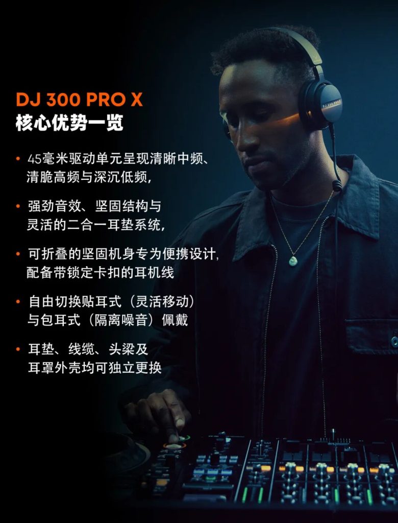 DJ 300 PRO X 与 DJ 300 PRO X CLUB 均为封闭式耳机,两款耳机搭载45毫米的单元,其中频聚焦突出、高频解析分明、低频饱满浑厚。底鼓、踩镲与打击乐元素清晰突出,让您在混音时能精准掌控提示信号,实现无缝过渡。即使在大声压级的情况下也能确保干净和稳定的有控制力音质,是精准监听与音频监测的理想之选。两款机型均针对俱乐部、音乐节等高噪音环境设计,同时也适用于快闪活动、屋顶派对、艺术展会或酒吧等场景中的时尚 DJ 表演。