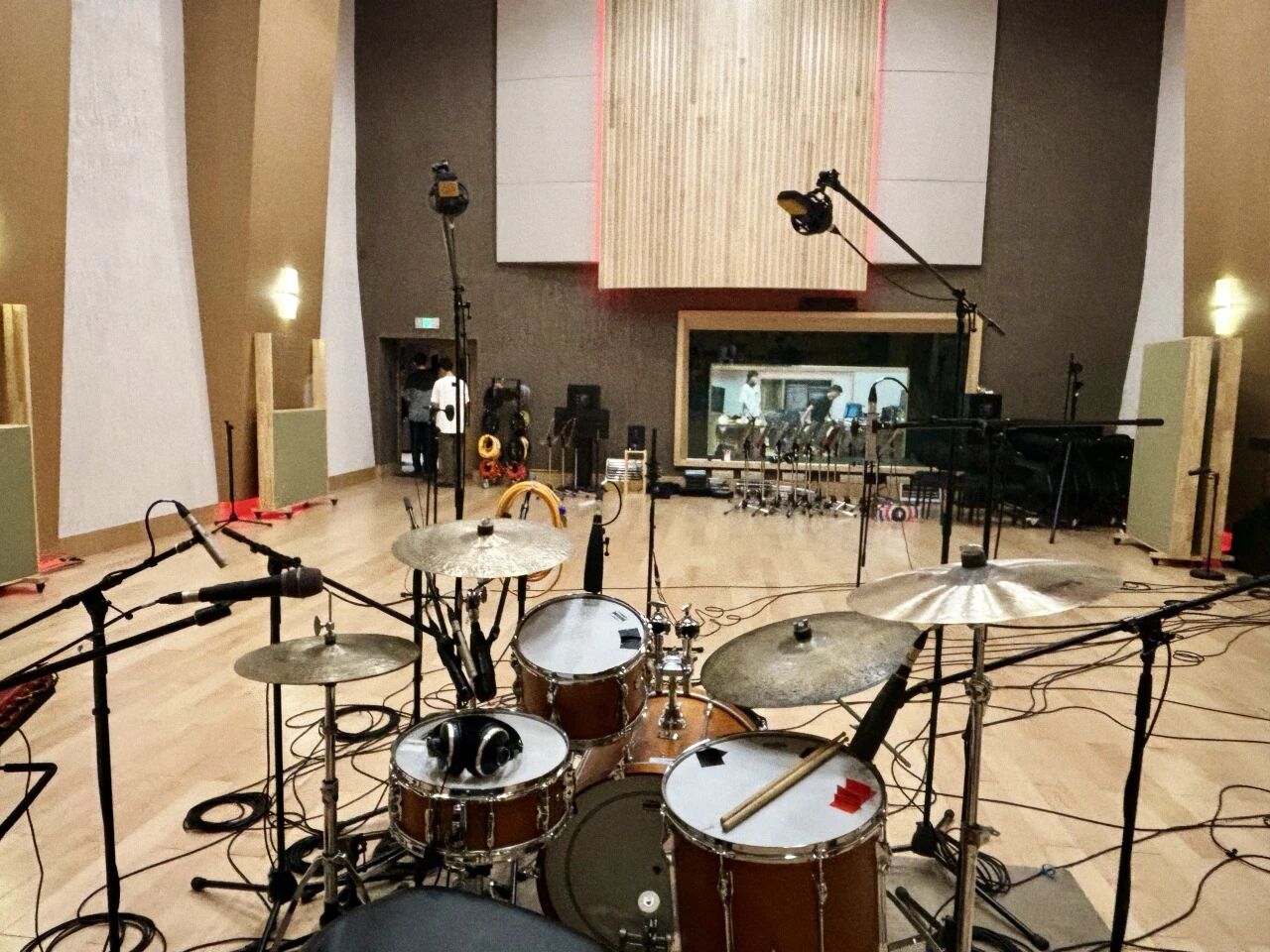 我们在电影学院较大的音乐录音棚里完成了鼓和小号的录制。鼓的录音中,我们使用了两组铝带话筒作为 Room Mic,在小号的录制中则采用了不同类型的话筒组合。我们不仅可以借此机会进行音质主观性评价,并且这些话筒为后期混音提供了更丰富的选择,也在杜比全景声制作中发挥了重要的作用。