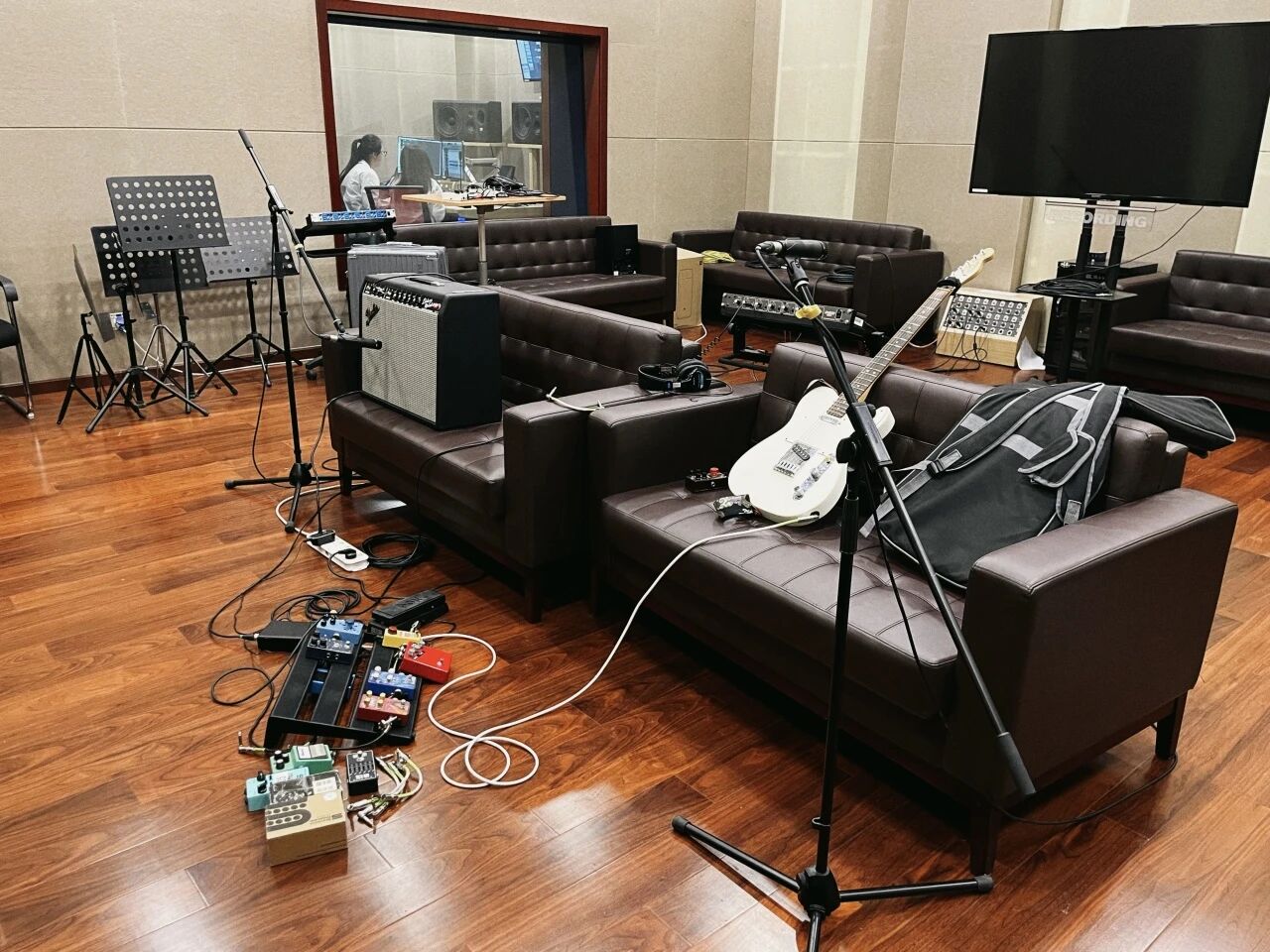 吉他、贝斯与人声的录制在较小的录音棚中进行,由于在编曲上这部分的轨道数较多,为了工程大小的合理化,我们在正式录音前进行了试录,快速选出了合适的音箱与话筒,合理控制了轨道数量。