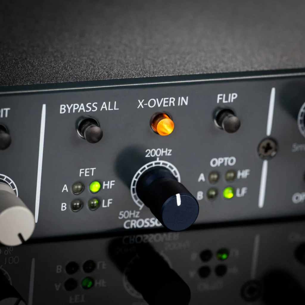 而在 Dual Band(双频段模式) 中,OptoFET 5046 通过可变分频系统(50 Hz – 500 Hz),将信号拆分为高频与低频频段,并由 FET 与 OPTO 分别处理,实现真正意义上的模拟双频段压缩。用户可自由指定哪一级压缩器负责高频或低频,为贝斯、人声、鼓组甚至总线处理带来极具创造力的声音可能。