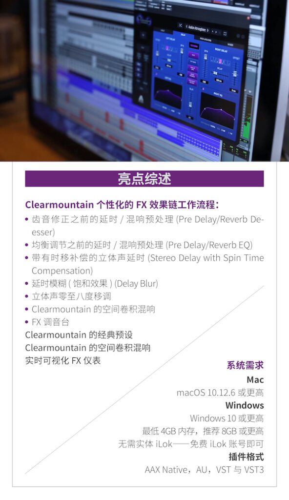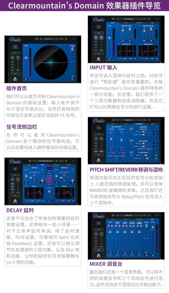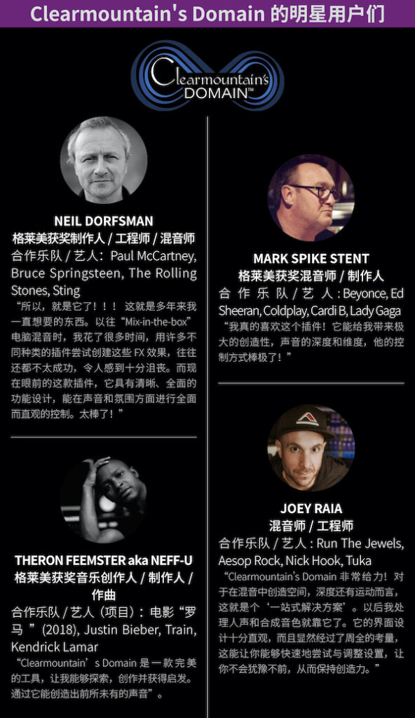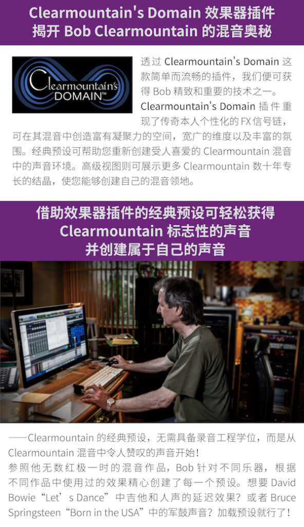 Clearmountain’s Domain是一款FX类效果器链插件,拥有Bob Clearmountain标志性的声学空间类效果处理流程中所用到的所有处理部分,包括Delay和Reverb之前的De-esser和EQ、可以独立控制的立体声Dealy以及Dealy部分的Blur处理、Delay部分的音高偏移处理、效果混音台、以及来自三个真实的混响室混响(其中包括Bob Clearmountain创立的北美著名混响室Mix This Studio混响室)!完全流程化的设计,实现了在一个插件内完成复杂FX效果处理的愿景。