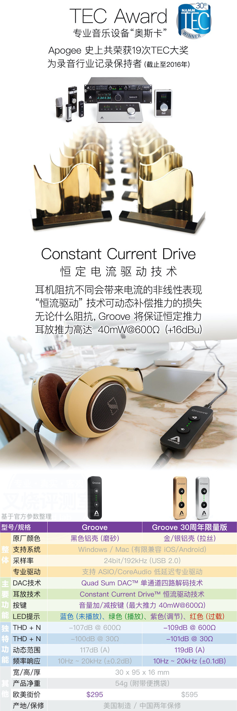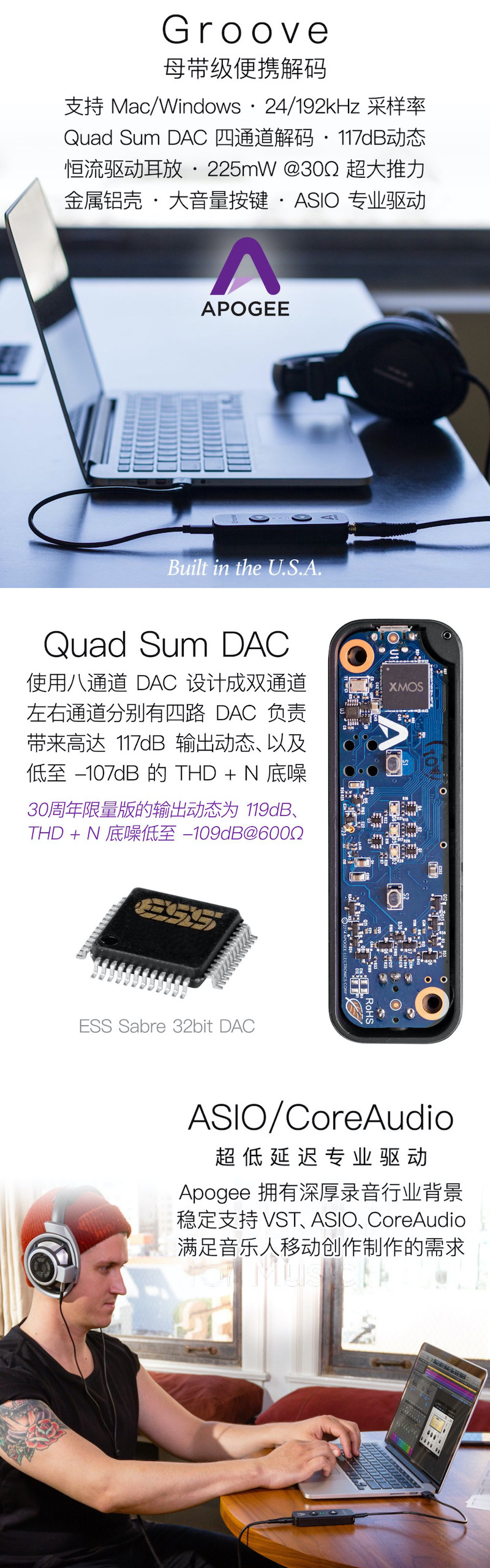 - Apogee 30 周年限量版 Groove为了纪念 Apogee 数字音频卓越的 30 年,Groove 还将有一个限量版提供。Groove 30th Anniversary Edition(Groove 30 周年限量版)将带有一个定制的加工铝制机身,性能增强,并将有银色和土豪金可选。