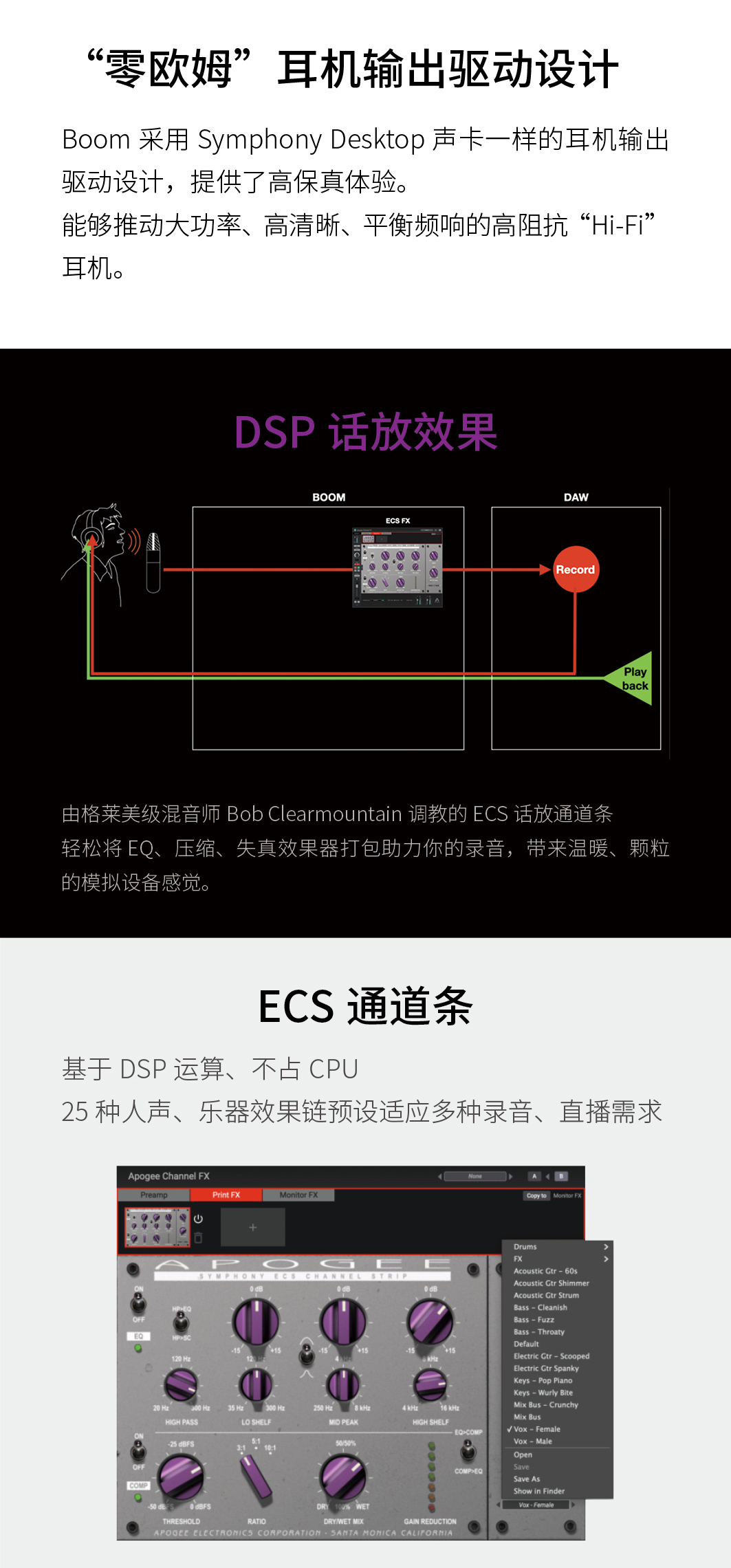 Boom的前置放大器提供了高达62dB的 “干净、无噪音 “的增益,这足以满足舒尔SM7B等需要功率的话筒的需要,而不需要云梯的帮助。该设备的AD转换器也来自Apogee,据说可以提供 “纯净的 “录音。