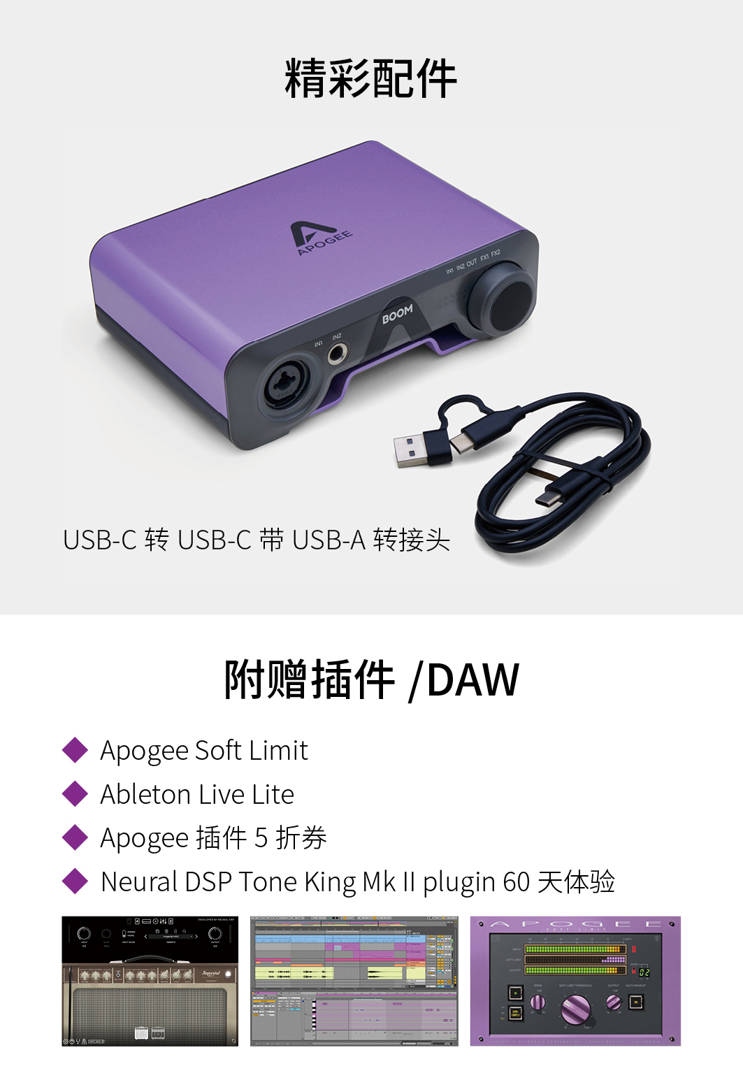 你还可以免费获得Ableton Live Lite和Apogee的Soft Limit插件–最重要的是,在Apogee的网络商店里,任何Apogee的插件或插件包都可以获得50%的优惠券。