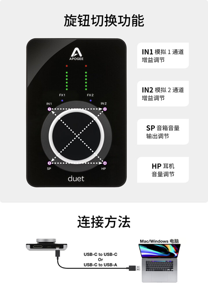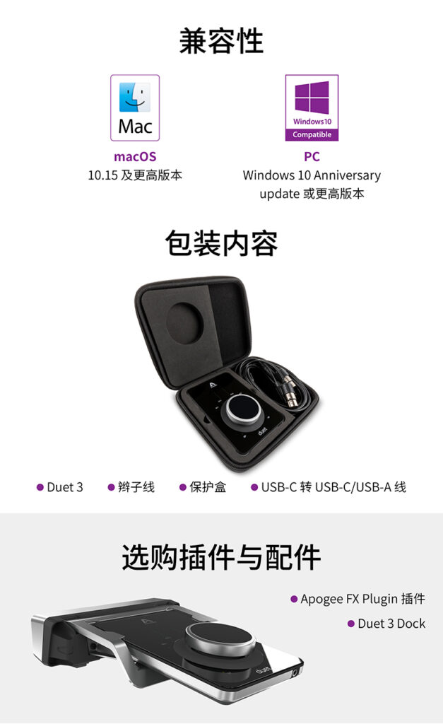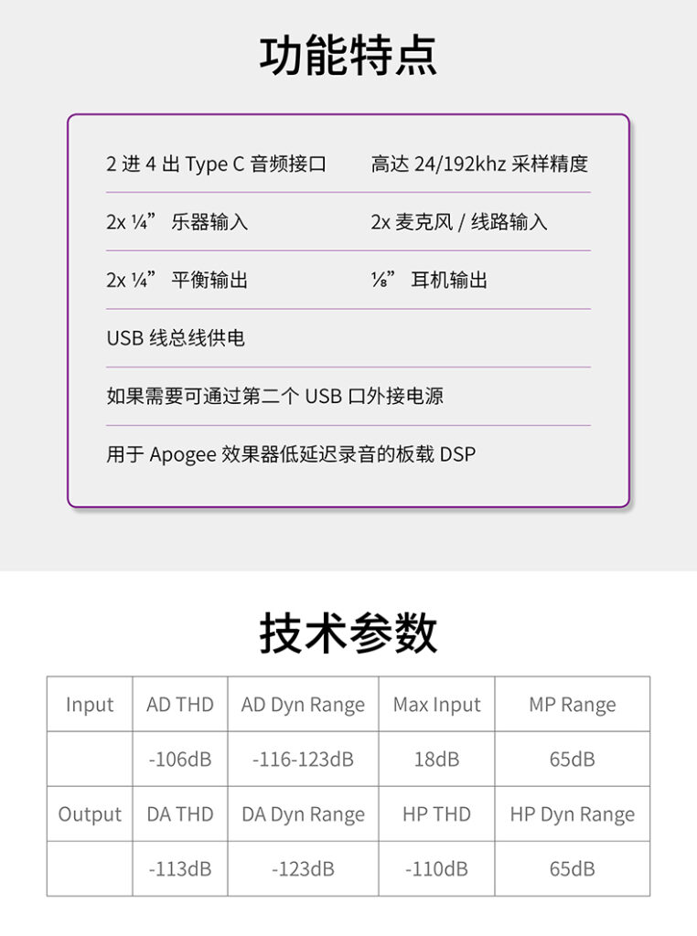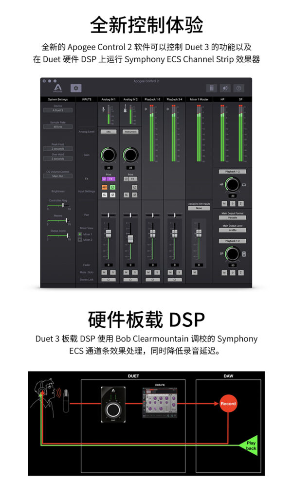 - 支持Apogee FX插件确保低延迟录制的板载硬件DSP
