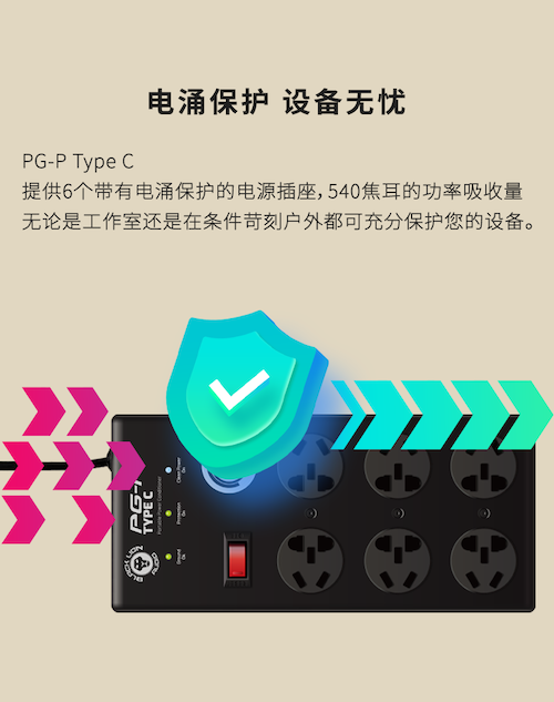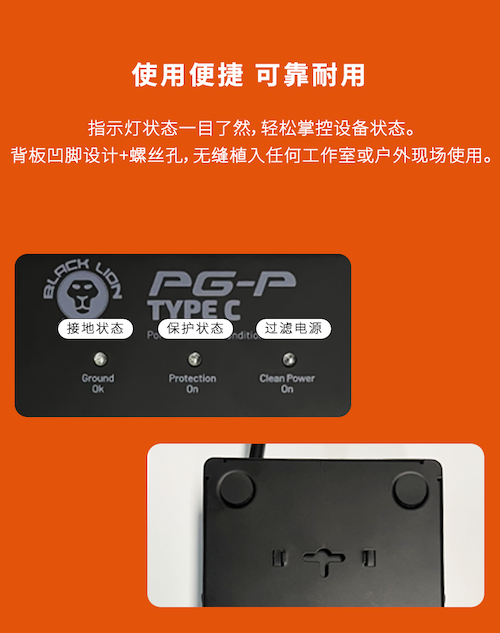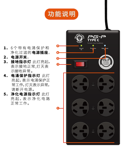 PG-P Type C是一个工作室级净化电源移动版,提供比其他同类产品更好的噪声过滤。PG-P保护您的设备远离电涌冲击,其性能可媲美高端机架型电源设备!虽然这个6插座的净化电源看起来和您家里的普通插排很相似但在它的引擎盖下有着复杂的信号处理魔法,内部使用优质的松下电容器和黑狮引以为傲的PG-P滤波技术,可以有效消除高输出电子产品常见的嗡嗡声和干扰,净化效果比同价位的电源好三倍。至于浪涌,请您放心,540焦耳的功率吸收量为您的设备提供了适当的保护措施。这样就可以确保您的设备时刻都在受到保护,在任何使用环境下都能发出最佳声音。