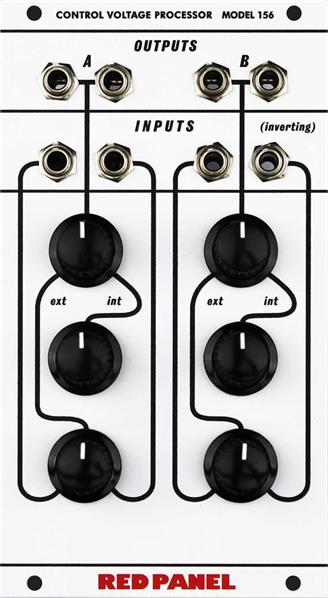156模块很可能是模块化综合产品中第一个可用的“CV操控”工具。在最初的100系列环境中,156被用于所有其他CV输入模块的前端设备。整个100系列中的大多数CV输入都没有在模块中内置相关的衰减器或偏置,因此它们依靠156来缩放,偏置Offsets和衰减在系统内的电压。156由2个独立的“电压处理器”组成,每个处理器都有一个控制器以混合两个输入,添加一个电压偏置(仅正向),然后一个控制处理的外部CV和内部偏置之间混合。此外,“ B”通道具有反相输入。