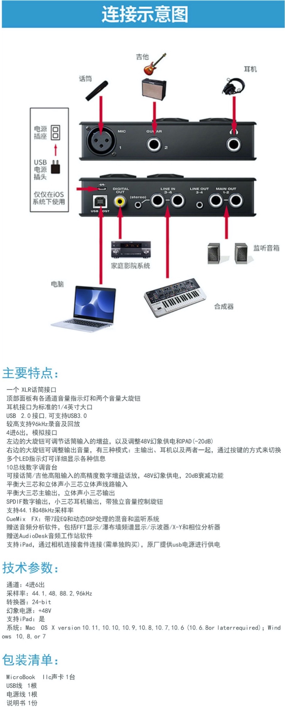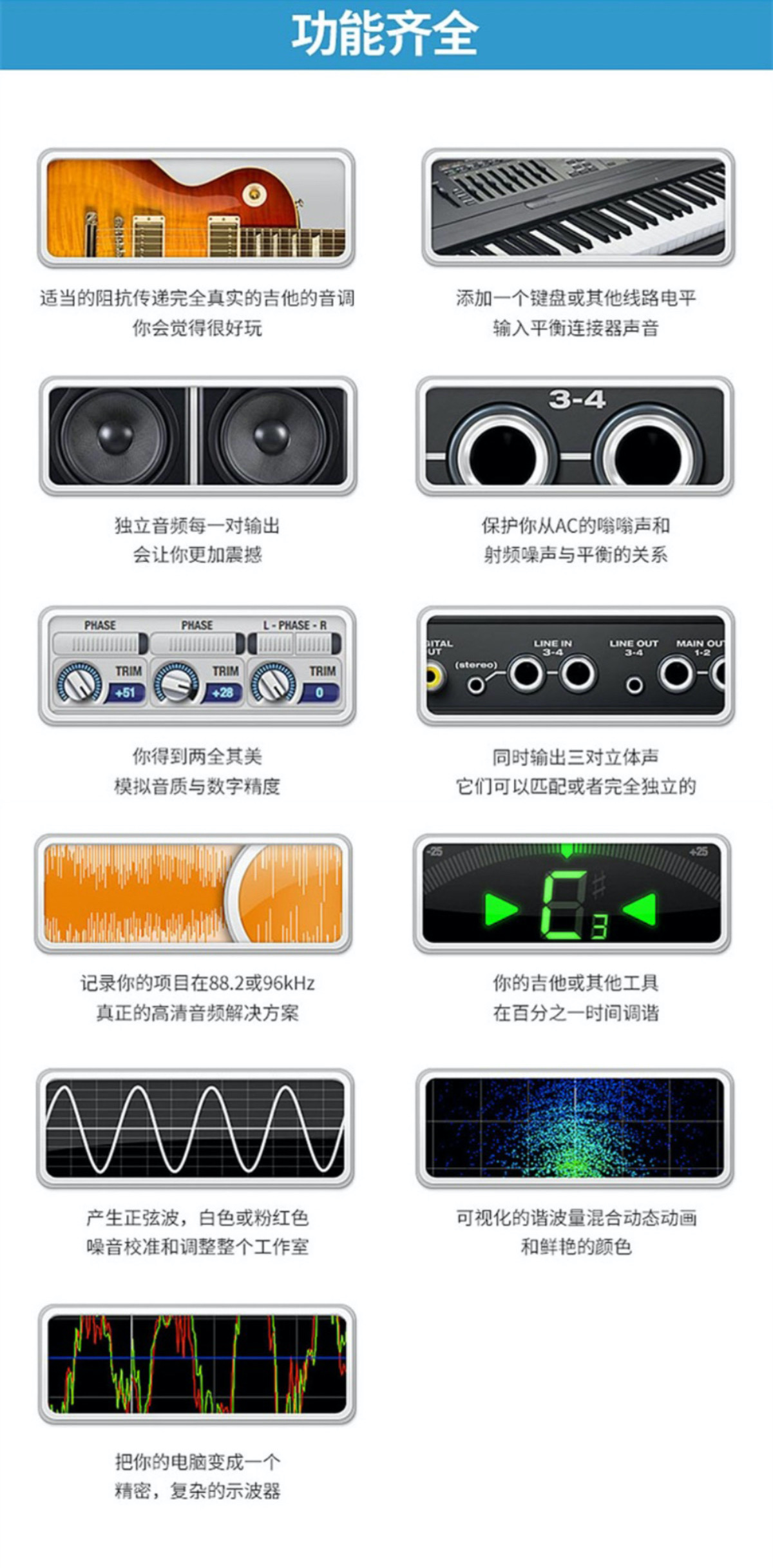 1 x 1/4″ 高阻抗吉他接口 2 x 1/4″ TRS 线路输入(平衡、非平衡) 1 x 1/8″ 立体声迷你接口(非平衡) |