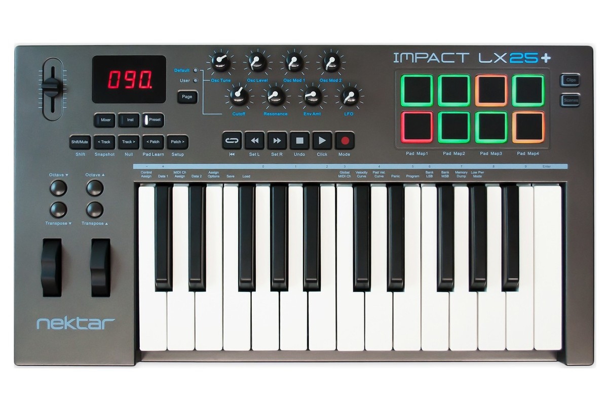 Nektar LX 25+具有更加便携的规格,全尺寸的力度感应键盘设计,还有带有弯音轮,调制轮,推子,旋钮,打击垫。利用面板上的推子、旋钮