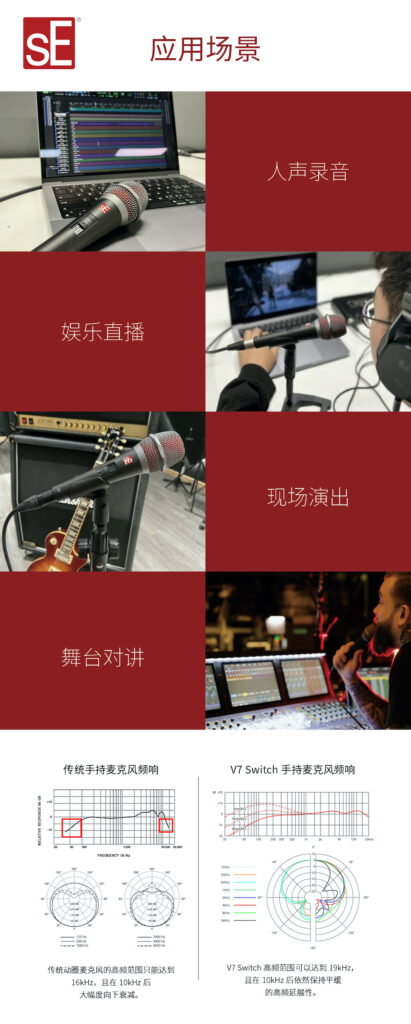 V7 SWITCH中定制研发的DMC7动圈元件所带来的清脆、开放的声音,能完美捕捉人声和乐器在舞台上最自然的状态。而且它精密的超心形指向设计有助于隔绝舞台上其他乐器串音,确保反馈前获得足够的增益。