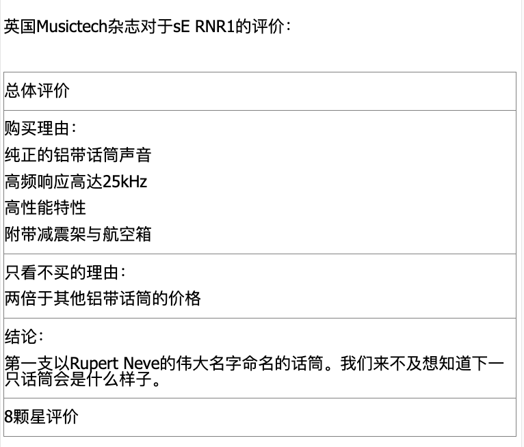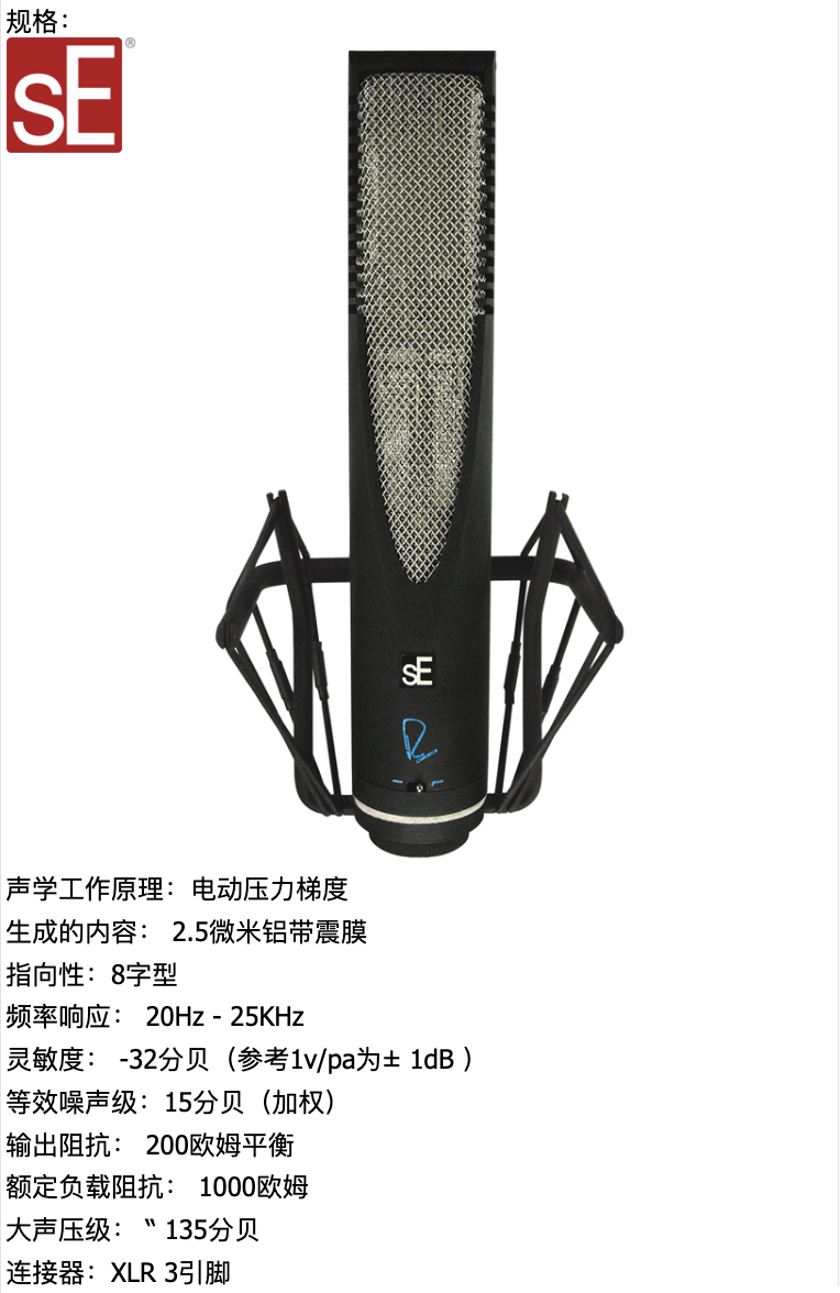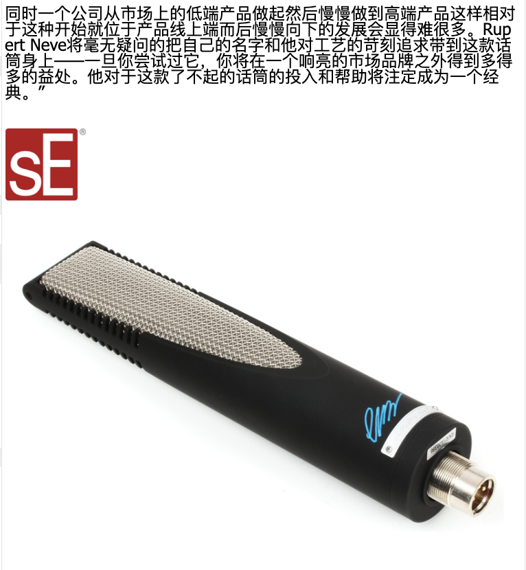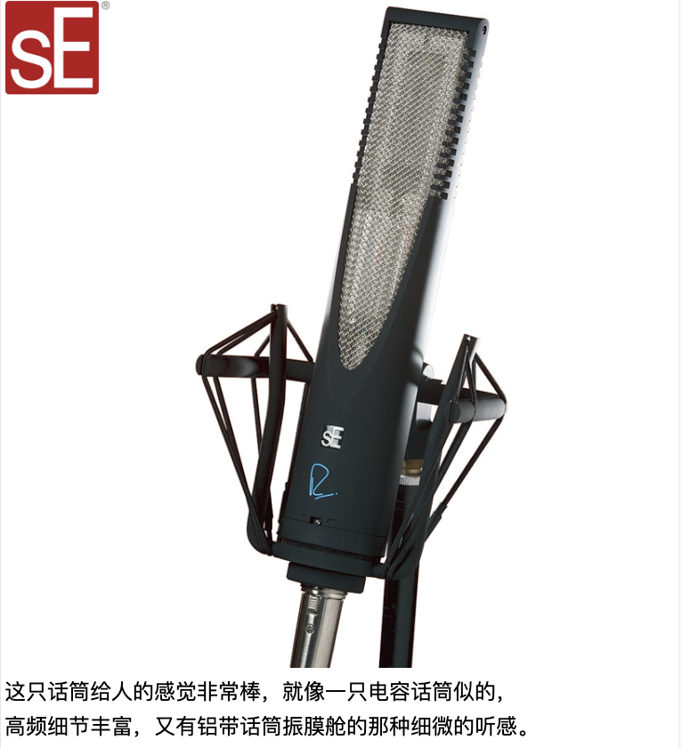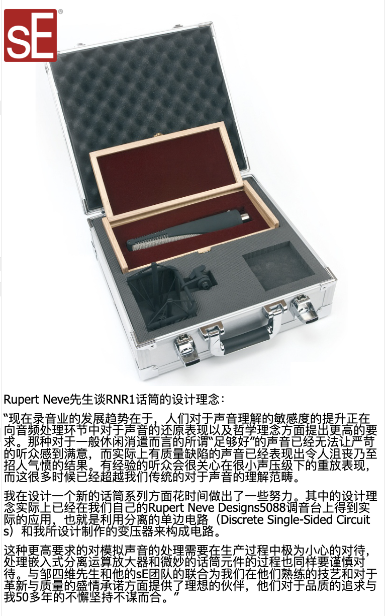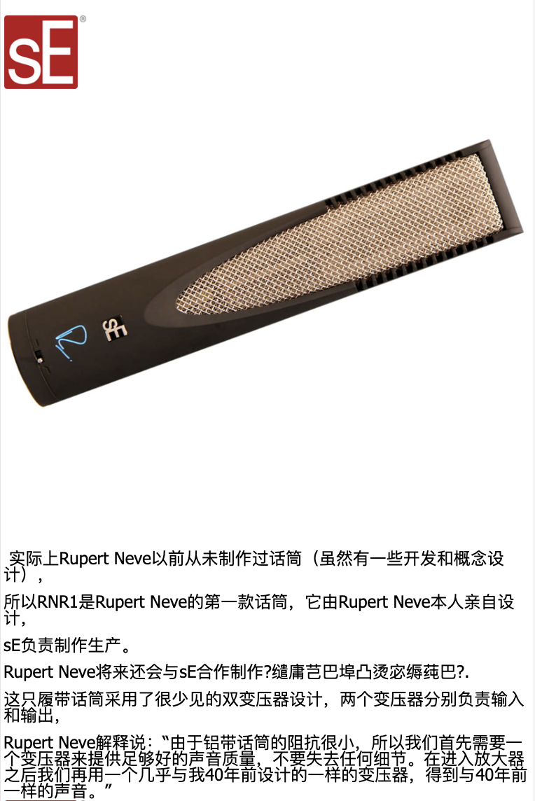 RNR1是Rupert Neve与sE合作开发的履带话筒,继承了Rupert Neve的传奇模拟电路设计。实际上Rupert Neve以前从未制作过话筒(虽然有一些开发和概念设计),所以RNR1是Rupert Neve的第一款话筒,它完全由Rupert Neve本人亲自设计,sE负责制作生产。Rupert Neve将来还会与sE合作制作电子管话筒和固体电容话筒。这只履带话筒采用了很少见的双变压器设计,两个变压器分别负责输入和输出,Rupert Neve解释说:“由于铝带话筒的阻抗很小,所以我们首先需要一个变压器来提供足够好的声音质量,不要失去任何细节。在进入放大器之后我们再用一个几乎与我40年前设计的完全一样的变压器,得到与40年前一样的声音。”这只话筒给人的感觉非常棒,就像一只电容话筒似的,高频细节丰富,又有铝带话筒振膜舱的那种细微的听感。