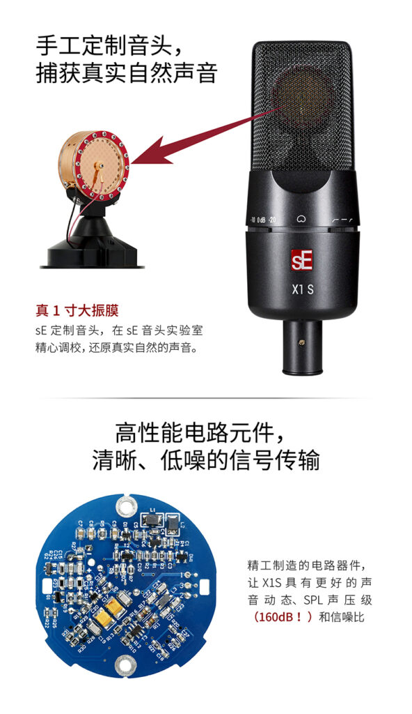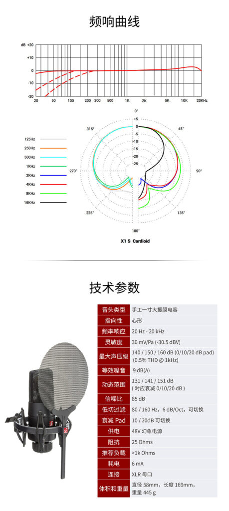 1、大振膜,心形指向,振膜仓由经验丰富的工程师手工精密制作与精细调试,高达30
