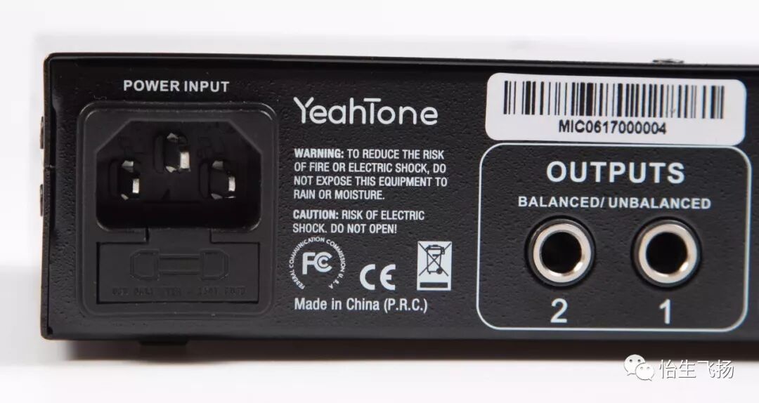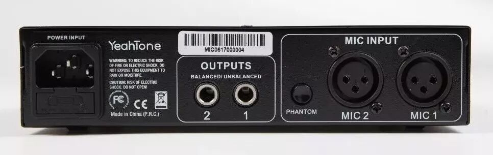 YeahTone MIC-1具有48V电源,当按下后面板上的PHANTOM按钮,可以启动48V幻象电源,给两个XLR接口都同时供电,最多可同时接入两路电容麦克风。
